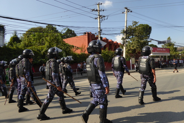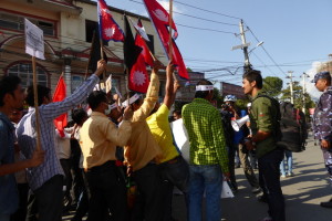 Schreiende Menschen mit Plakaten, Polizisten mit Schutzschild und Schlagstöcken… noch sind die Demonstrationen friedlich, die sich über die Stadt verteilen und sich besonders in Lazimpat in der Nähe der indischen Botschaft konzentrieren. Aber wie lange noch?
