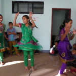 Kebi, der Pflegevater, hatte schon für uns eine kleine ‚Ehrenloge‘ aufgebaut. Traditionell wurden wir Drei mit einer Blütenkette als Zeichen der Hochachtung und einer Tika, dem Segenszeichen auf der Stirn, begrüßt. Ben und ich verteilten dann die leckeren Fruchtsäfte, damit wir zünftig auf unser Wiedersehen anstoßen konnten. Und dann begann auch schon das Begrüßungsprogramm mit Tanz und Gesang.