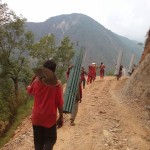Da sich Ramechhap direkt über die ‚Foot Hills‘ des Himalayas erstreckt, kann selbst der Jeep nicht bis zu den zerstörten Dörfern vordringen. Also müssen sämtliche Hilfsgüter -egal ob Baumaterial, Generatoren und Geräte oder Lebensmittel und Trinkwasser- die letzten Kilometer auf den Rücken der Menschen transportiert werden. Und das alles bei Temperaturen von um die 30 Grad! Die starken Regengüsse, die den Monsun ankündigen, erschweren die Arbeit zusätzlich.