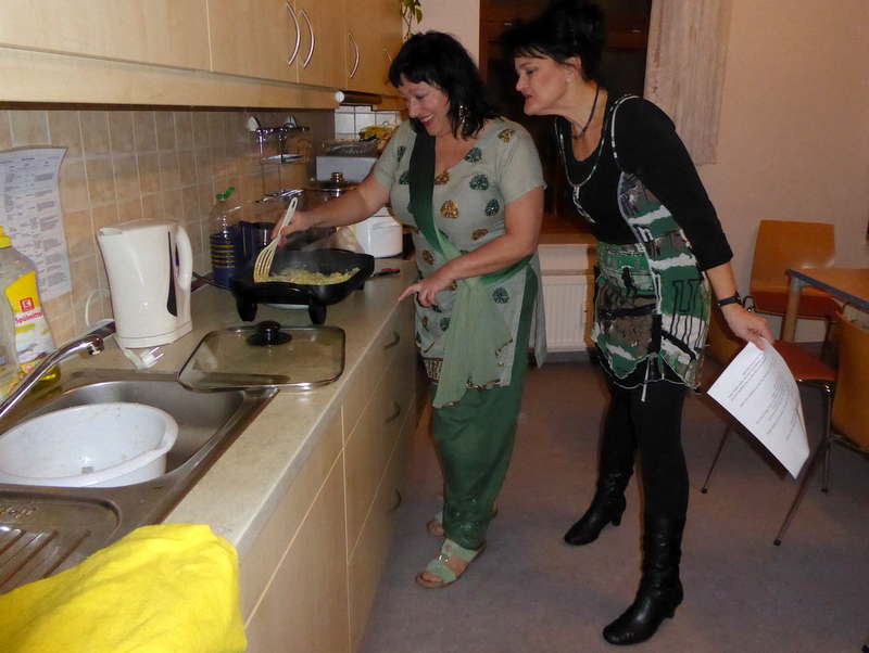 Und so ging es am Donnerstag voll bepackt mit Gemüse und Reis, mit Linsen und Gewürzen sowie Vortragstechnik auf den Weg nach Neustadt. Bis zum Beginn der offiziellen Veranstaltung war noch etwas Zeit, so dass wir die Zutaten schon vorbereiten konnten. Vicky, die Tochter einer Freundin, ging mir dabei besonders zur Hand. Nach und nach trudelten die Mitglieder der Wohngruppe in der gemütlichen Küche ein und beteiligten sich an den Schäl- und Schnippelarbeiten. Die Wiedersehensfreude war genauso groß wie der Spaß an der gemeinsamen Arbeit!